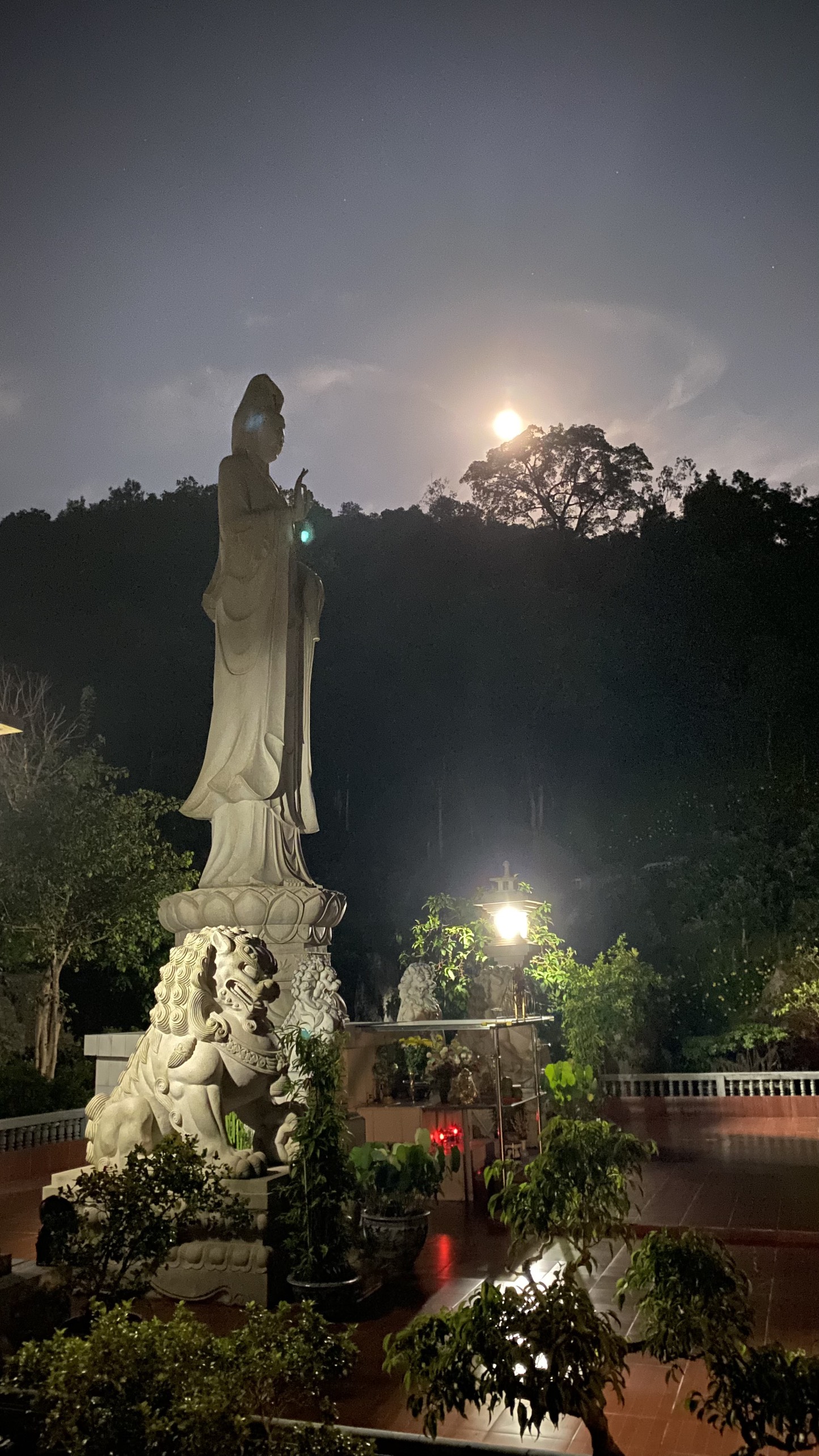 Sân chùa được lát bằng đá công nghiệp với kích thước lớn, có hai ngôi tháp được xây bằng gạch. Bên trái có Lầu chuông, bên phải có Lầu trống xây trên cấp nền cao chín bậc thềm, hình tứ giác, hai tầng mái ngói, xung quanh xây lan can đá. Trước cửa Chính điện đặt một quả cầu Như Ý bằng đá hoa cương đỏ, đường kính 1.59m, nặng 6.5 tấn được lấy từ mỏ đá An Nhơn, Quy Nhơn, Bình Định. Quả cầu được đặt trên bệ đá có tiết diện vuông nặng 4.5 tấn. Tất cả nằm gọn trong hình bát giác với tám bồn hoa bao quanh, tượng trưng cho Bát chính đạo